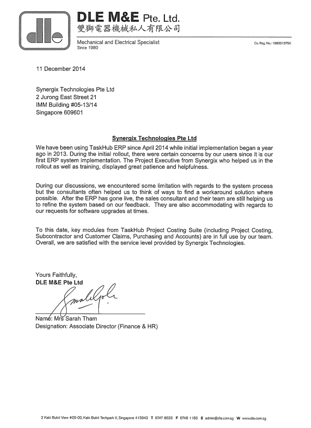 Kami telah menggunakan ERP TaskHub sejak April 2014, sementara implementasi awal dimulai setahun sebelumnya pada 2013. Selama peluncuran awal, terdapat kekhawatiran tertentu dari para pengguna kami karena ini merupakan implementasi sistem ERP pertama bagi kami. Project Executive dari Synergix yang membantu kami dalam proses peluncuran serta pelatihan menunjukkan kesabaran dan bantuan yang luar biasa.