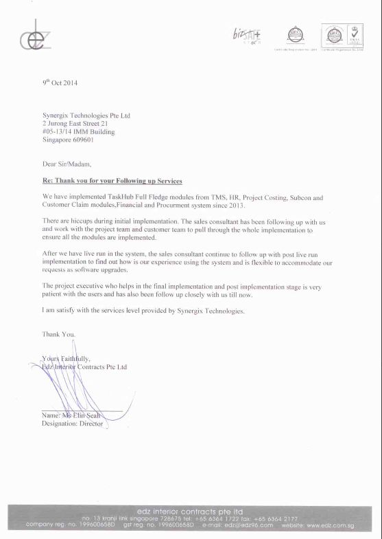 Saya merasa puas dengan tingkat layanan yang diberikan oleh Synergix Technologies.