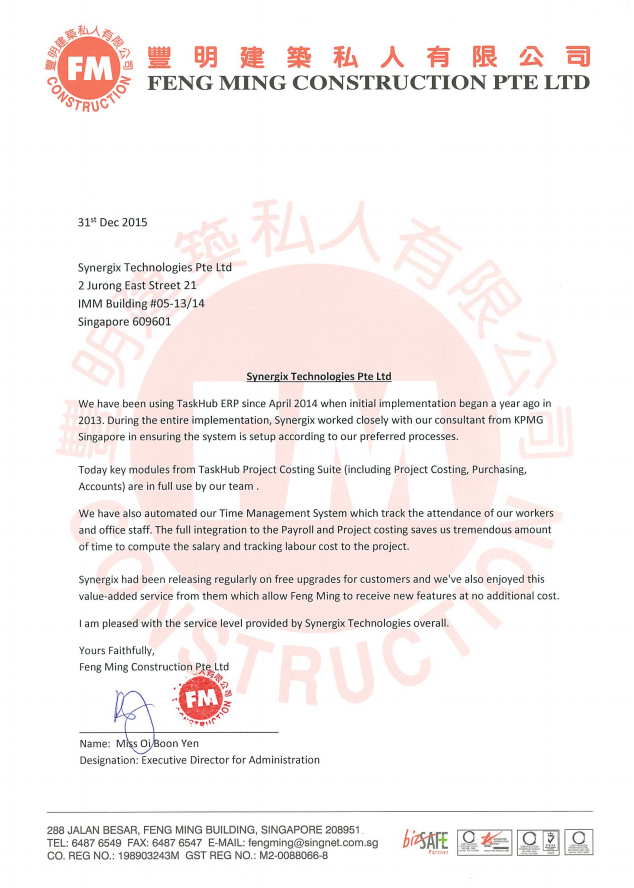 Kami telah menggunakan TaskHub ERP sejak April 2014, di mana implementasi awal dimulai setahun sebelumnya pada 2013. Selama seluruh proses implementasi, Synergix bekerja sama erat dengan konsultan kami dari KPMG Singapura untuk memastikan sistem dikonfigurasi sesuai dengan proses kerja yang kami inginkan.