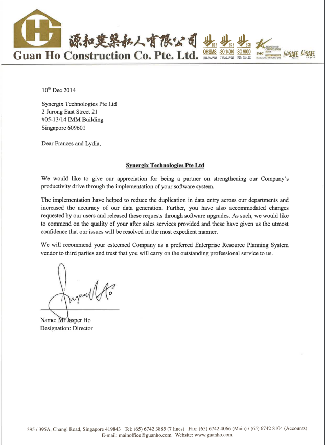 Kami akan merekomendasikan Perusahaan Anda yang terhormat sebagai vendor Sistem Perencanaan Sumber Daya Perusahaan (ERP) pilihan kepada pihak ketiga dan percaya bahwa Anda akan terus memberikan layanan profesional yang luar biasa kepada kami.
