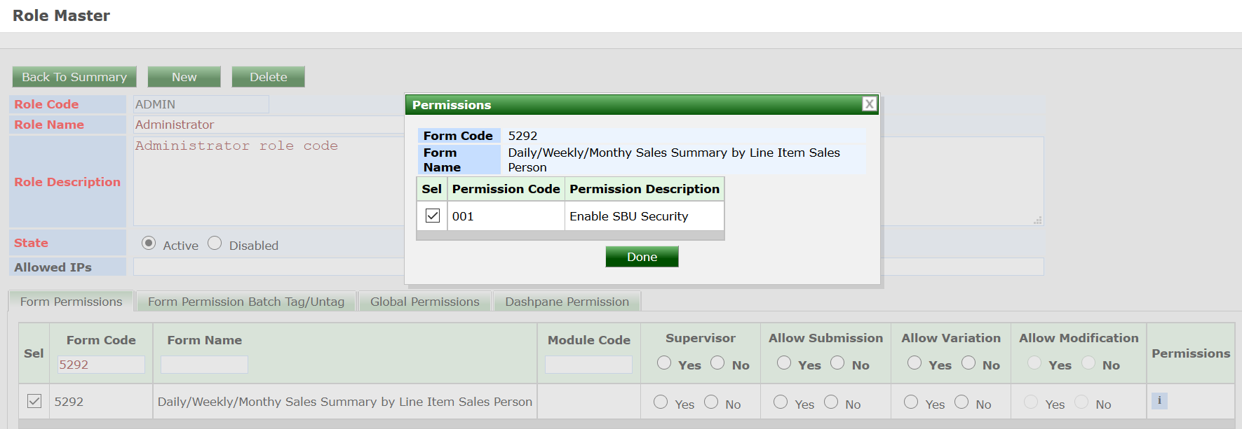 We have added a permission code in Role Master so that if “Enable SBU Security” is set to Yes (refer below screenshot), the user can only see the reports that are viewable for his specific SBU. If the option is set to No, then the user can filter the reports by different SBU and access the data.