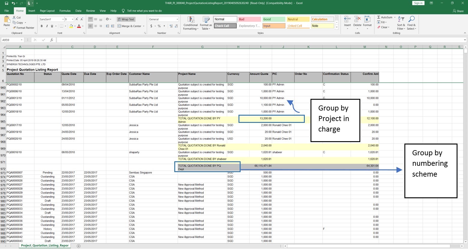 The Project Quotation Listing Report in Synergix E1 ERP System is meant to list down all project quotations being in draft, pending approval, outstanding and history grouping by Project in charge and Numbering scheme of the quotation No.
