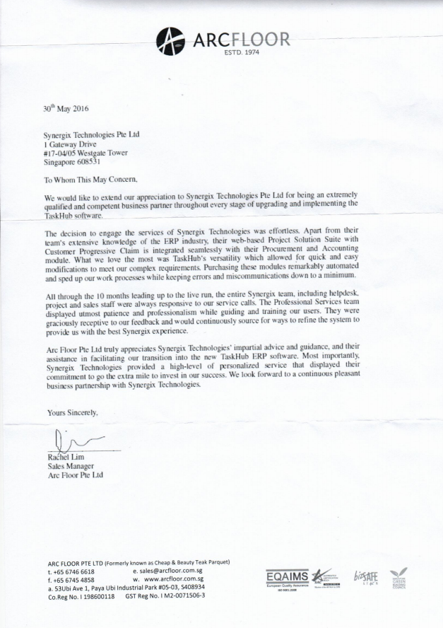 บริษัท อาร์ค ฟลอร์ จำกัด ขอขอบคุณสำหรับคำแนะนำที่เป็นกลางและการดูแลจาก Synergix Technologies รวมถึงความช่วยเหลือที่ช่วยให้การเปลี่ยนผ่านมาสู่ซอฟต์แวร์ TaskHub ERP ตัวใหม่เป็นไปอย่างราบรื่น และที่สำคัญที่สุด Synergix Technologies ได้มอบการบริการเฉพาะบุคคลในระดับสูง ซึ่งแสดงให้เห็นถึงความมุ่งมั่นที่จะดูแลเราอย่างเต็มที่เพื่อความสำเร็จขององค์กร เราหวังเป็นอย่างยิ่งว่าจะเป็นพันธมิตรทางธุรกิจที่ดีต่อกันเช่นนี้ตลอดไป
